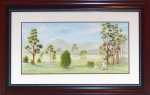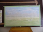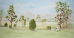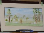 I move forward selecting the colour and tone or intensity as I go. When you look at this stage you can already see the difference in the location of the paddocks. Then came the beginning of the stand of trees, trunks first. Set on the right hand side they are very tall slender gums. from memory there were 9 rows that all had to be painted in order to make sure that the ones located at the back, looked like they were at the back, I made it easier for myself by adding the faintest of pencil numbers near each one across the whole scene. There were some trees that were on the same plane (or level) in other areas of the painting also.