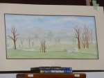 Once all the tree trunks were painted I went back over the whole piece, to make sure that the overall depth of colour change was good, and not too intense at the very front. I have also lightly put in the beginning of foliage on some of the furthest trees away, lightly painted the stream in, and put the first wash on the cows.