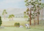 On the right hand side there are a couple of very small young trees just behind the cows, and you can tell that the ground level changes behind the cows. This is where the creek is tucked down out of sight.Then the bank rises on the other side going up to the stand of gum trees. Notice how the trees here also get lighter and a bit blurry as they go into the distance. There is also a large paddock in the middle ground that goes across the whole scene, with another just across the creek, all this helps to give you that feeling of the mountains being far away, which of coarse they are.
