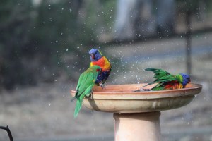 Photo- One Musk parrot and 2 Rainbow Lorikeets-